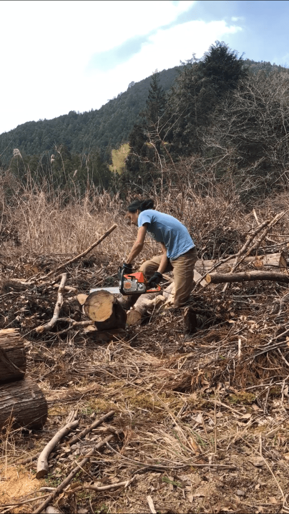 チェーンソー持って木を切り、